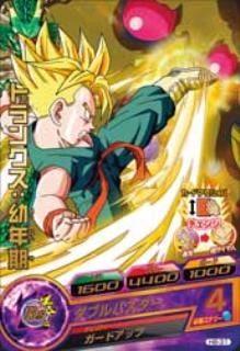 H8-31トランクス:幼年期 レアリティ★★ HP:1600パワー:2400ガード:1000 超サイヤ人 2ラウンド目以降アタッカーにすると、カードアクションが発生する。成功すると、変身し、パワー+2000。[1回限り] ダブルバスター 必要エナジー:4 アビリティ:ガードアップ 2ラウンド目でガード+500。