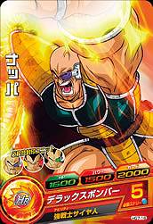 HG7-16ナッパ HP:1600パワー:1500ガード:2000 デラックスボンバー 必要エナジー:5 アビリティ:強戦士サイヤ人 れんけいアタックを受けた時、ダメージを50%軽減する。[毎回] アルティメットユニット:必殺技封印ユニット 敵チーム全員の必殺技をふうじる。[1ラウンド限り] 消費エナジー:4