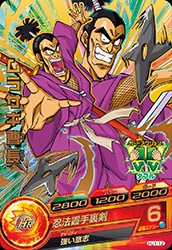 HJ1-12ムラサキ曹長 レアリティ:★★ HP:2800:パワー:1200:ガード:2000 痛恨のダブルアタック 2ラウンド目以降アタッカーにすると、チーム攻撃時にパートナーと一緒にダブルアタックする。さらに、超ダブル効果で自分とパートナーの敵に与える気力ダメージが永続で超アップする。[1回限り] 忍法霞手裏剣 必要エナジー:6 アビリティ:強い意志 攻撃によってきぜつするダメージを受けた時、絶対にきぜつしない。[1回限り]