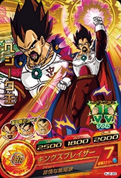 HJ2-30ベジータ王 レアリティ:★★ HP:2500:パワー:1800:ガード:2000 痛恨のダブルアタック 2ラウンド目以降アタッカーにすると、チーム攻撃時にパートナーと一緒にダブルアタックする。さらに、超ダブル効果で自分とパートナーの敵に与える気力ダメージが永続で超アップする。[1回限り] キングズブレイザー 必要エナジー:7 アビリティ:非情な策略家 1ラウンド目終了時に、敵チームのヒーローエナジーを−2。 アルティメットユニット:混乱暗示ユニット敵チーム全員のチャージインパクトスピードをランダムにする。[1ラウンド限り] 消費エナジー:4