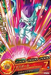 HJ7-27フリーザ HP:2300パワー:2600ガード:2000 デスボール 必要エナジー:7 アビリティ:仕組まれた守り 自分が攻撃を受けたとき、チャージインパクトに勝利すると、敵のパワーを永続で−2000。さらに、パーフェクト勝利すると、敵のパワーを永続で−4000。[毎回]