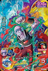 HGD2-CP7タゴマ レアリティCP HP:3400パワー:2200ガード:1500 宇宙最悪の力 敵チームに「孫悟空」「ベジータ」「孫悟飯:青年期」「ピッコロ」のいずれかがいると、自分のチャージインパクトスピードを変える効果を無効にする&絶対にきぜつしない。[永続] 無力化攻撃 必殺技が発動できる時にアタッカーにすると、 ロックオンした敵を攻撃し、その敵のパワーを1にする。[1回限り] バッドランサー 必要エナジー5 アビリティ:ほとばしる闘志 3ラウンド目開始時、自分の気力を全回復する。 アルティメットユニット:超ダメージ回避ユニット 敵チーム全員のダメージアップ効果を無効にする。ただし、バーストによるダメージアップ効果は無効にできない。[永続] 消費エナジー:3