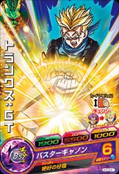 HGD3-51トランクス:GT HP:1900パワー:3500ガード:1000 超サイヤ人 2ラウンド目以降アタッカーにすると、カードアクションが発生する。成功すると、変身し、パワー+2000。[1回限り] バスターキャノン 必要エナジー6 アビリティ:絶好の好機 戦闘力バトル時、毎回ガードが100未満の仲間のパワーとガードを+5000し、チャージインパクトスピードを遅くする。[1ラウンド限り]