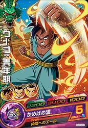 HGD3-53ウーブ:青年期 HP:2200パワー:3400ガード:1000 かめはめ波 必要エナジー5 アビリティ:仲間へのエール サポーターにして、仲間にリンクラインをあてると発動。仲間の気力を回復する。[毎回] アルティメットユニット:エナジーチャージユニット 自分チームのヒーローエナジーが2倍になる。[永続] 消費エナジー:1