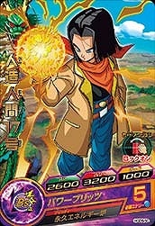 HGD5-50人造人間17号 HP:2600パワー:3200ガード:1000 残酷な攻撃 必殺技が発動できる時にアタッカーにすると、ロックオンした敵を攻撃し、その敵のガード−1000。[1回限り] パワーブリッツ 必要エナジー:5 アビリティ:永久エネルギー炉 ラウンド終了時、自分チームのHPを500回復&自分の気力を回復する。[毎回]